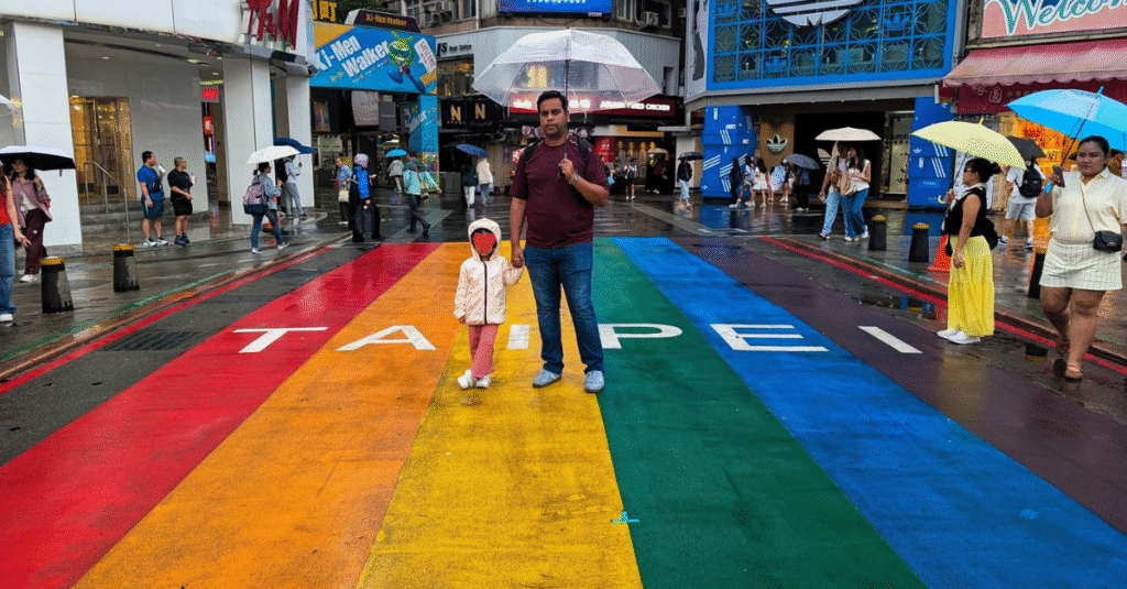 If you’d told me years ago that I’d be weaving a stroller through neon alleys while my husband darted after street-food smells and Little A pointed at everything like she was directing an orchestra, I might not have believed you. But here we are: Taiwan, Day 1. And what a first impression it was… color, chaos, culture, and kindness wrapped into one beautifully orderly-disorderly city.